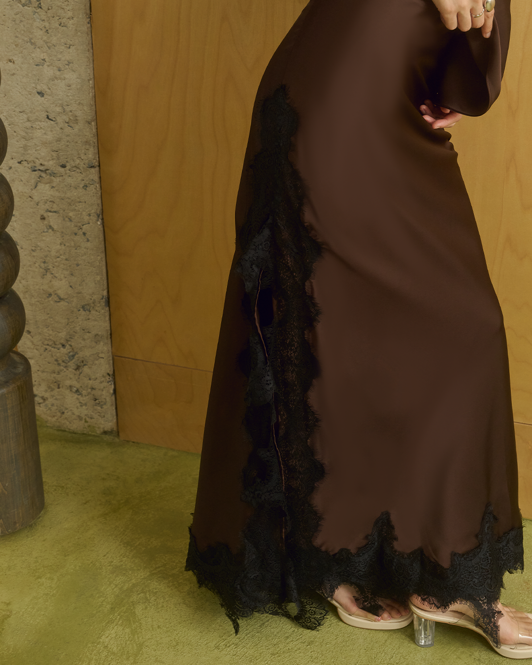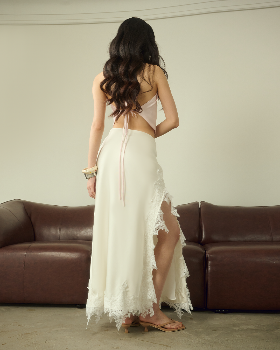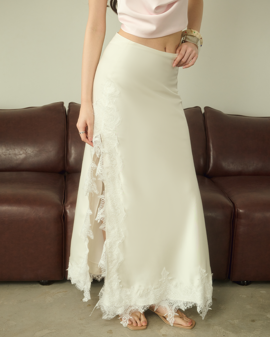กระโปรงเอวต่ำ เนื้อผ้าซาตินพลิ้วเงางามแต่งขอบลูกไม้ พร้อมผ่าข้าง