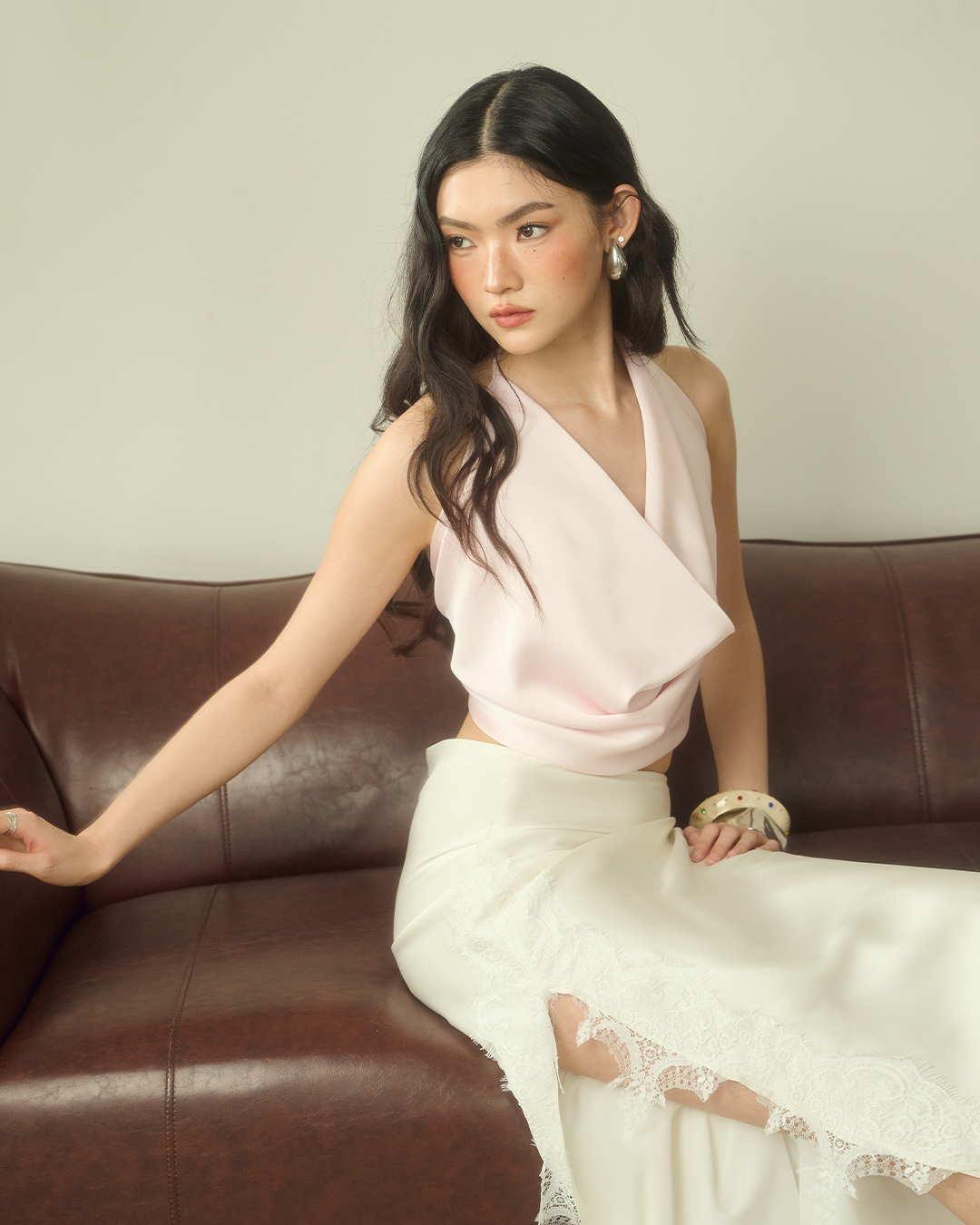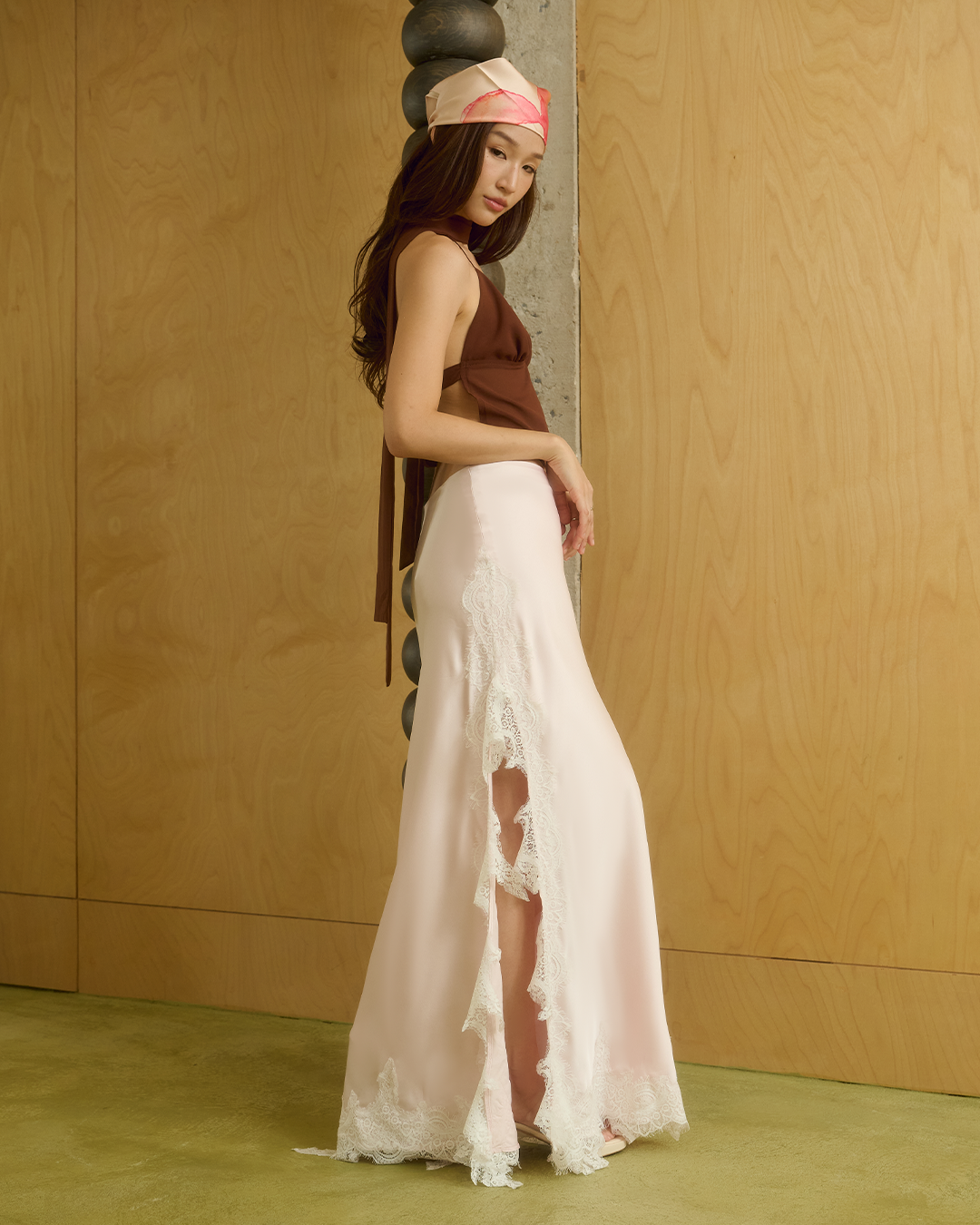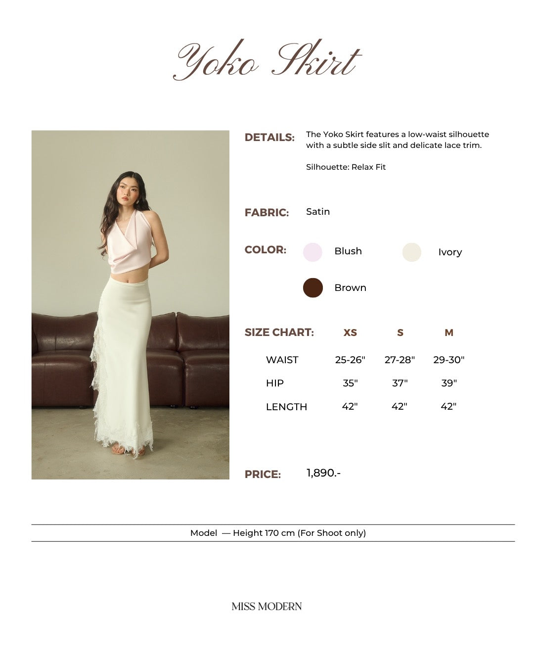 กระโปรงเอวต่ำ เนื้อผ้าซาตินพลิ้วเงางามแต่งขอบลูกไม้ พร้อมผ่าข้าง