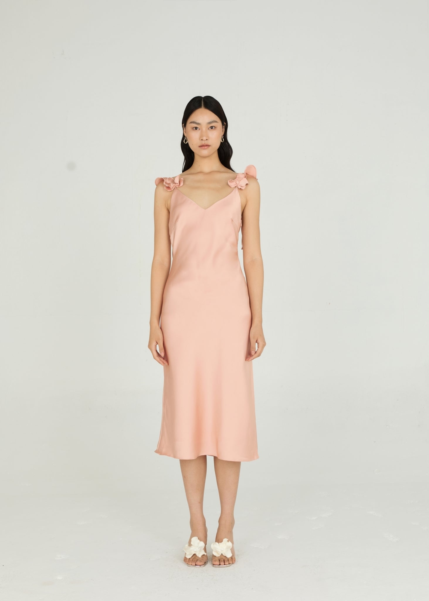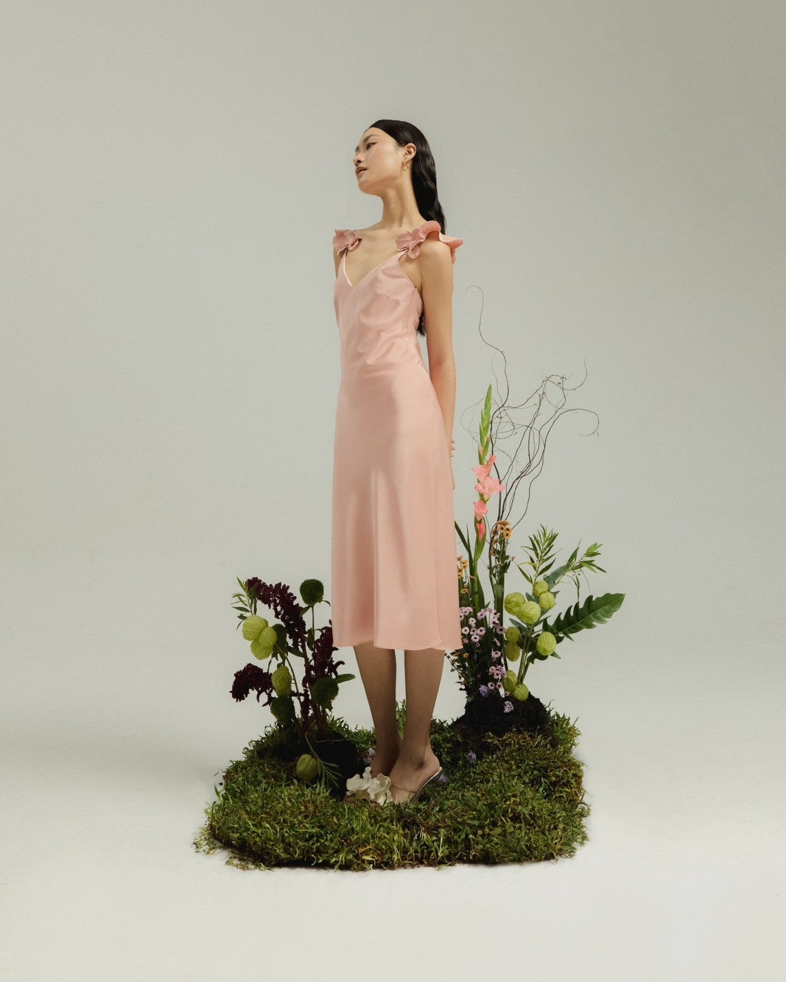 The Olivia Midi Dress is an elegant and stylish choice for any occasion. Crafted from luxurious satin fabric, it features a delicate ruffle strap and handmade flowers for a touch of femininity. The side slit adds a flirtatious element to the design. Perfect for making a statement with understated sophistication.