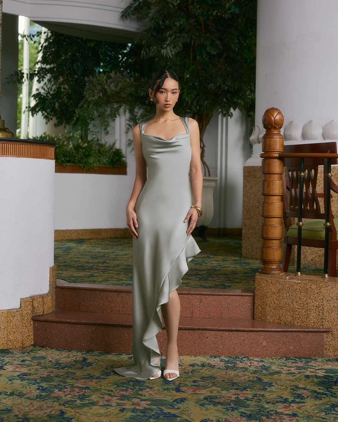 One dress, endless moods—satin cowl neck, open back, and fluid ruffle slit.