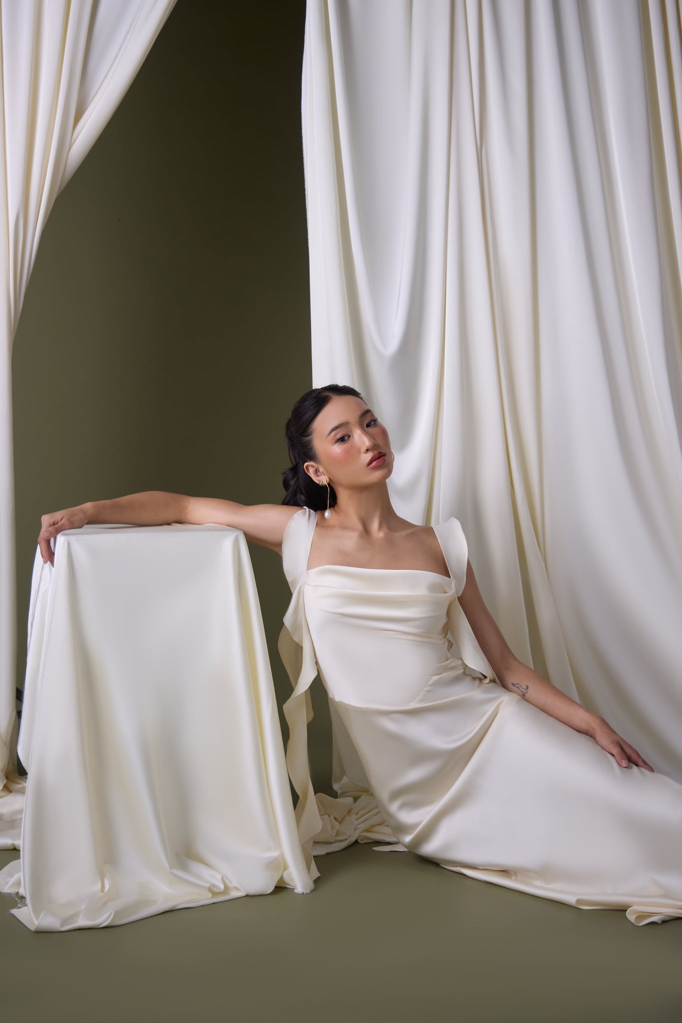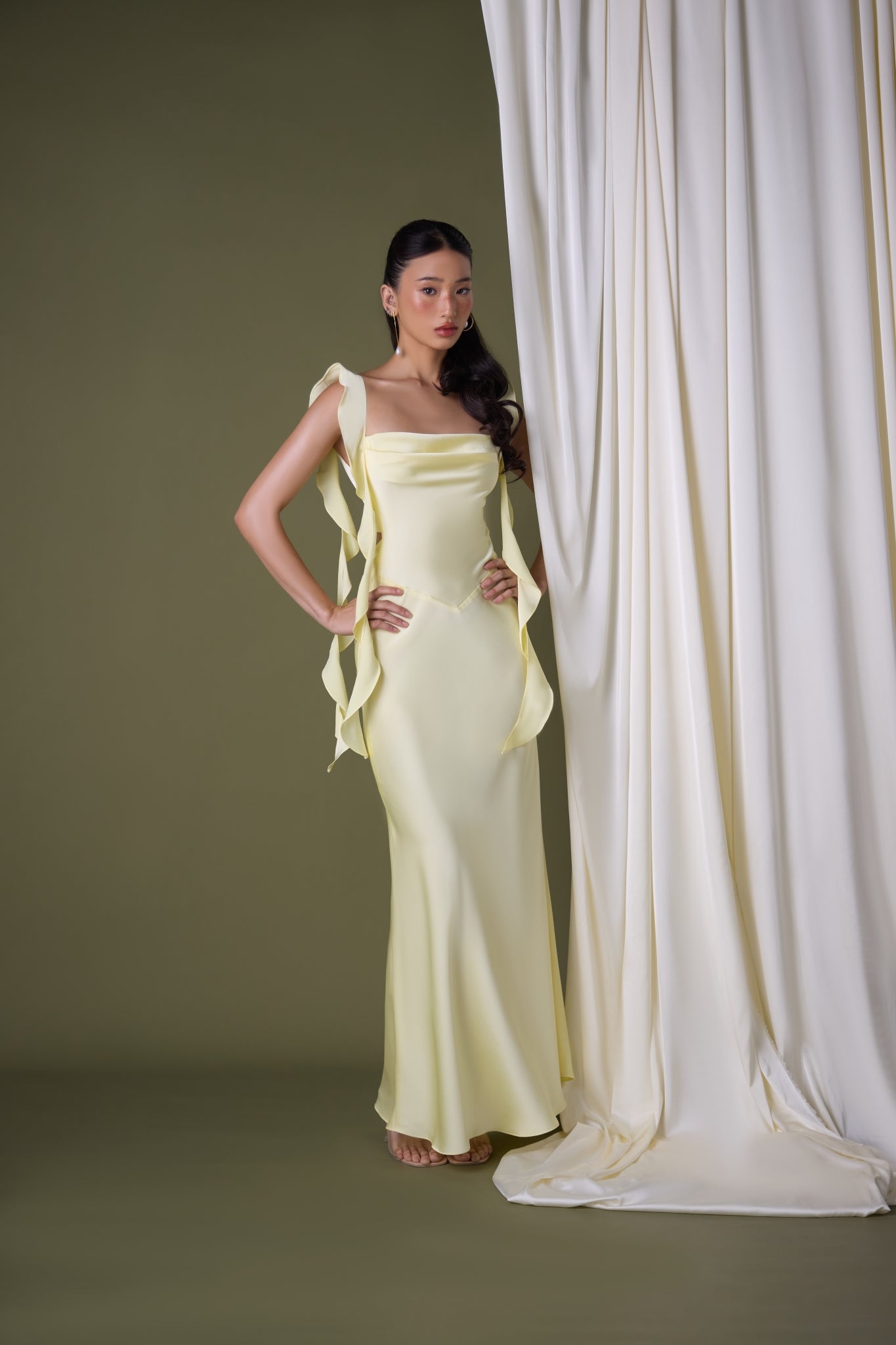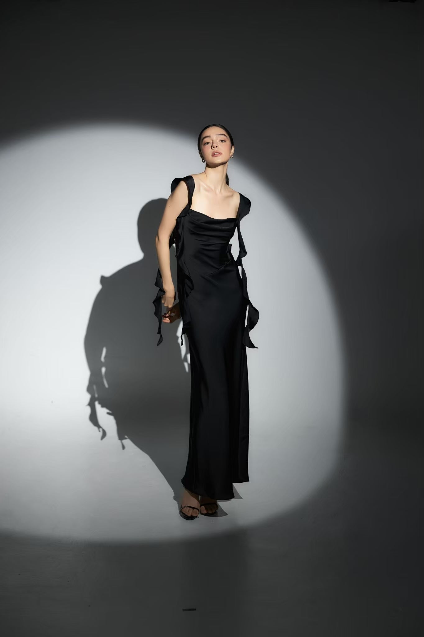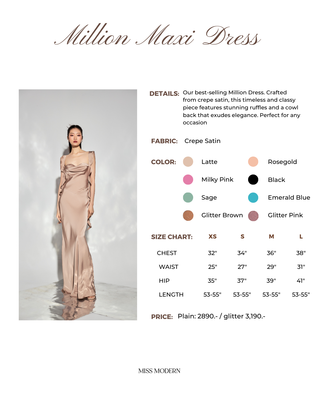 Indulge in luxury with our best-selling Million Dress. Crafted from crepe satin, this timeless and classy piece features stunning ruffles and a cowl back that exudes elegance. Perfect for any occasion, this dress is a must-have in your wardrobe. Elevate your style and make a statement with Million Dress.
