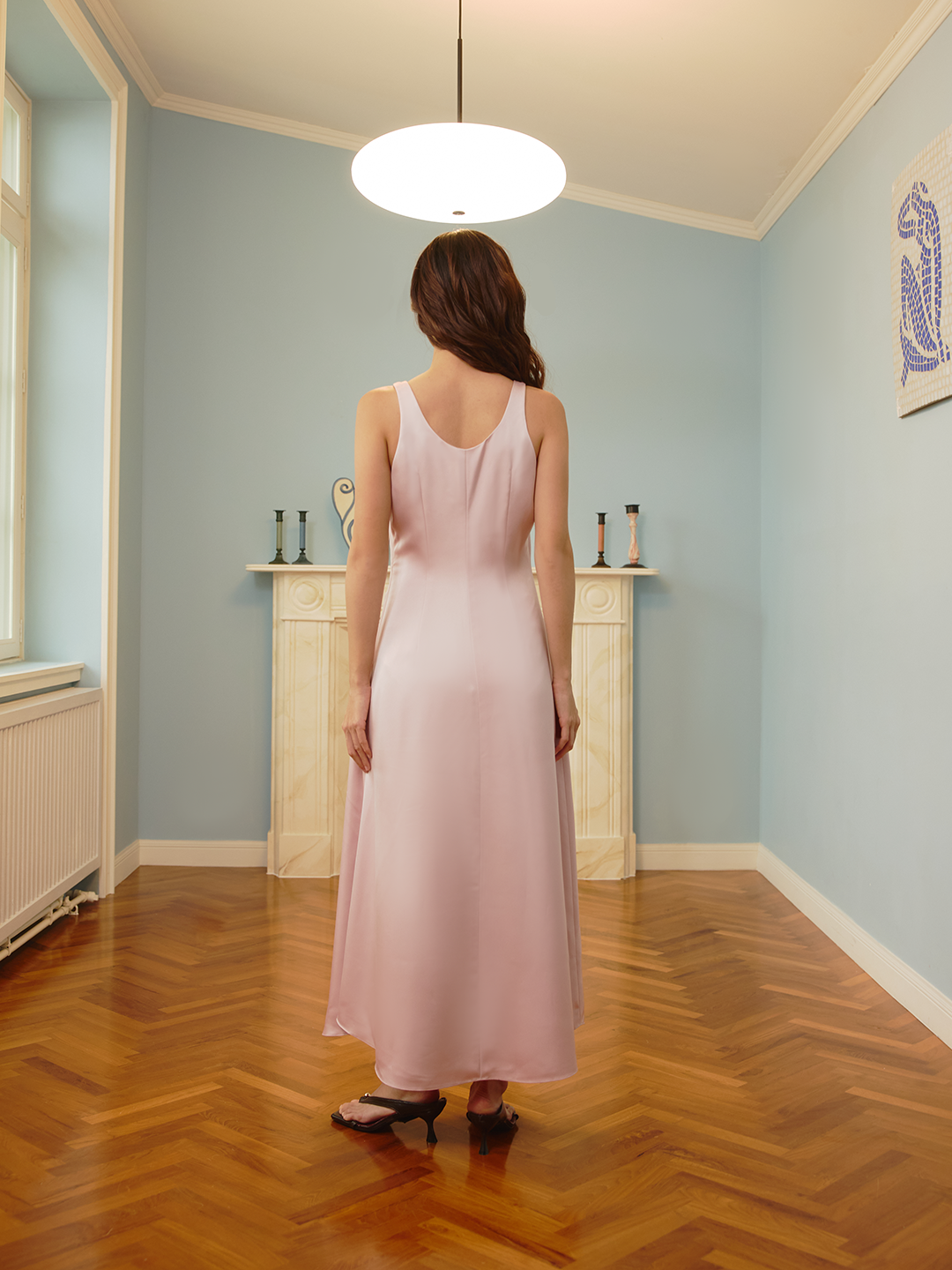A silky satin midi dress with a soft U-neck and effortless drape. The Olivia Dress moves with grace.Easy elegance for any occasion.